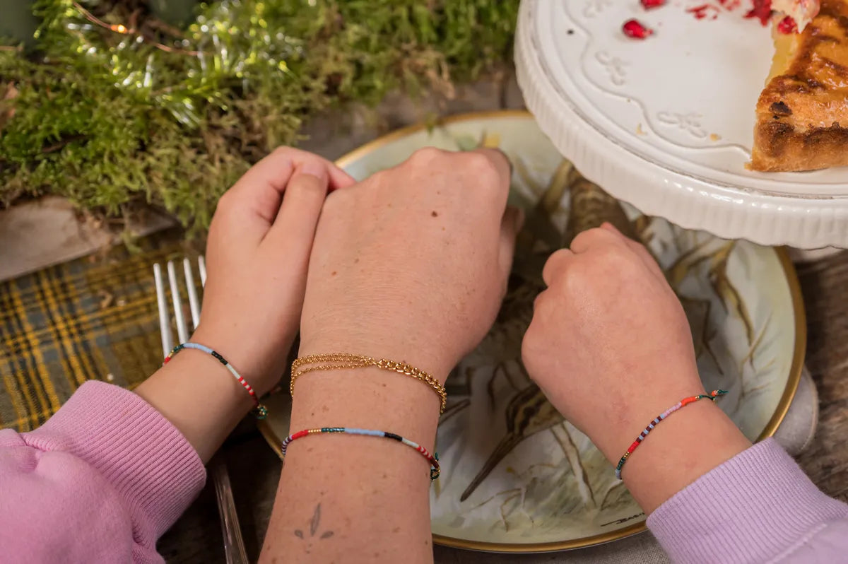 Doe het wensbandje rond je pols, trek aan op maat en schuif dan de kraaltjes uit elkaar wanneer je de touwtjes niet wil laten bengelen.